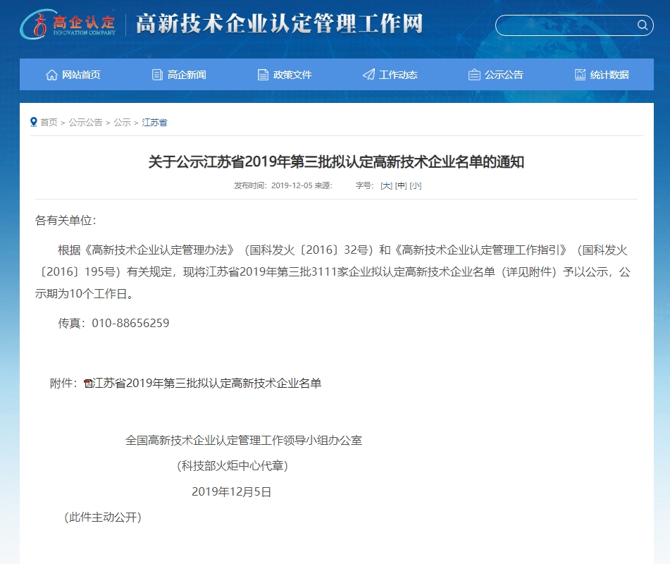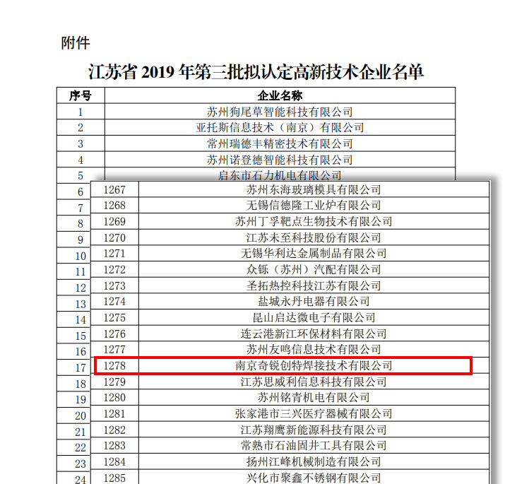 根據(jù)《高新技術(shù)企業(yè)認定管理辦法》(國科發(fā)火〔2016〕32號)和《高新技術(shù)企業(yè)認定管理工作指引》(國科發(fā)火〔2016〕195號)有關(guān)規(guī)定,南京奇銳創(chuàng)特焊接技術(shù)有限公司榮膺江蘇省2019年認定的第三批高新技術(shù)企業(yè)。